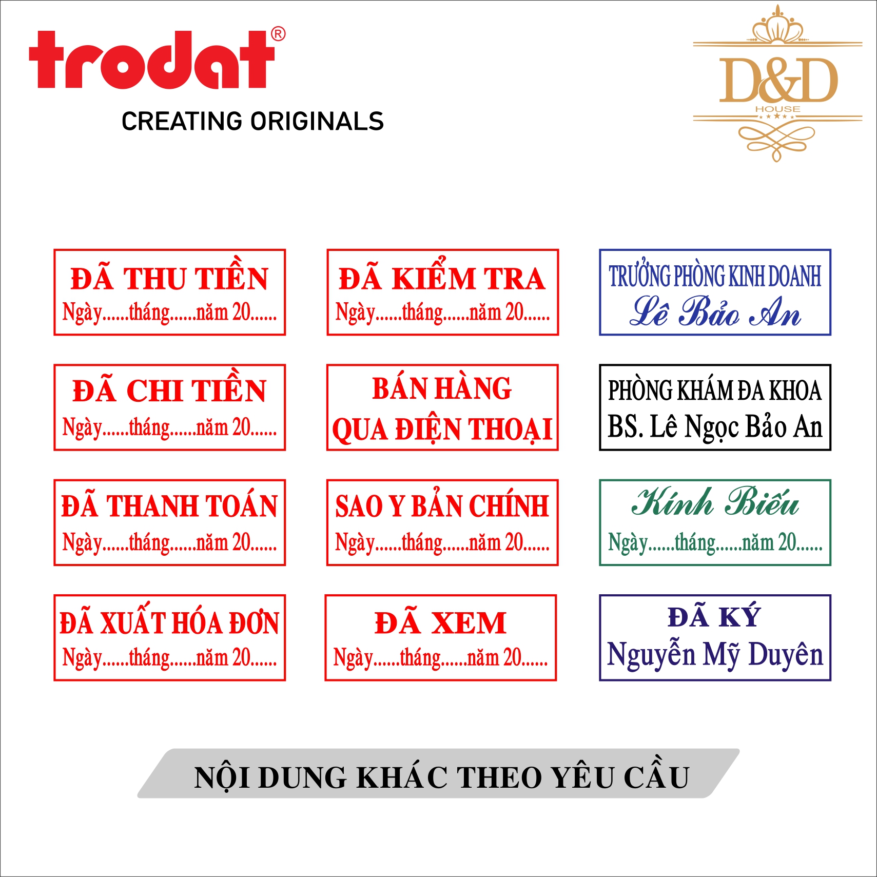 - Stamp content: 1 or 2 lines, name, title, other on-demand contents…