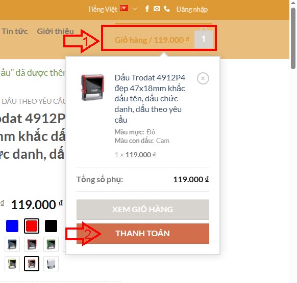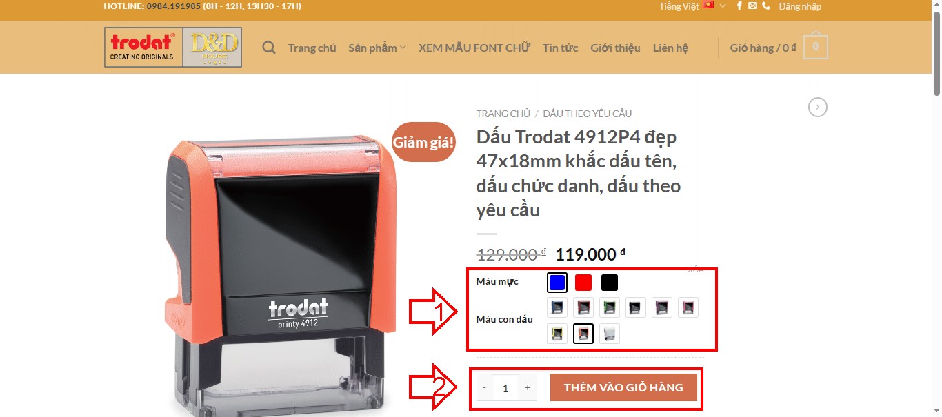 3. Chọn màu sản phẩm (màu mực, màu vỏ dấu), chọn số lượng. Bấm THÊM VÀO GIỎ HÀNG.
