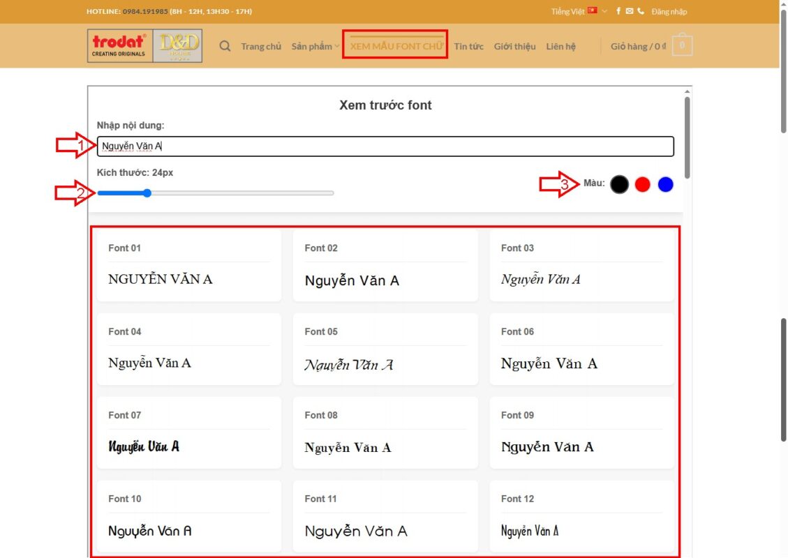 5. Bạn có thể xem trước Font chữ để chọn Font yêu thích bằng cách bấm vào Menu XEM MẪU FONT CHỮ. Gõ nội dung con dấu (VD tên của bạn), điều chỉnh kích thước Font, chọn màu chữ. Trang web sẽ tự động hiển thị nội dung đó với 80 font chữ. Bạn chỉ cần nhớ số thứ tự Font (VD: font 30) để ghi chú vào đơn hàng cho shop ở bước thanh toán. Nếu Font bạn cần không có trong danh sách thì có thể gởi mẫu chữ cho shop qua Zalo 0356.992530. Font gì shop cũng có.