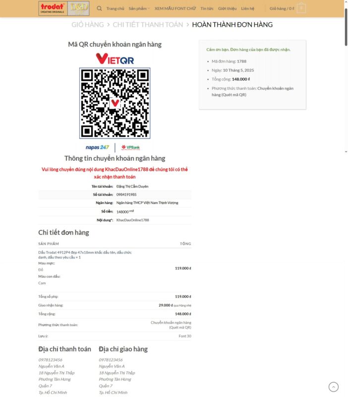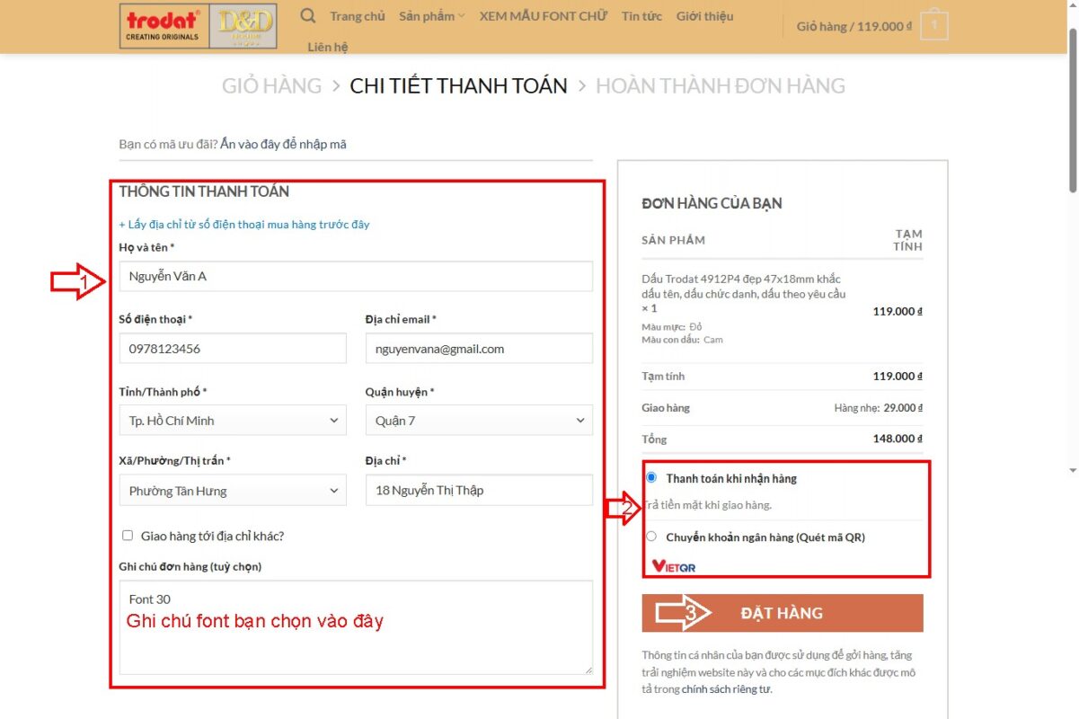 7. Điền các thông tin của người nhận hàng vào các ô tương ứng (Tên, SĐT, email, địa chỉ…). Ghi chú font chữ bạn chọn hoặc các yêu cầu khác nếu có (không bắt buộc). Chọn phương thức thanh toán: COD hoặc quét mã QR chuyển khoản ngân hàng. Bấm THANH TOÁN để hoàn thành đặt hàng.
